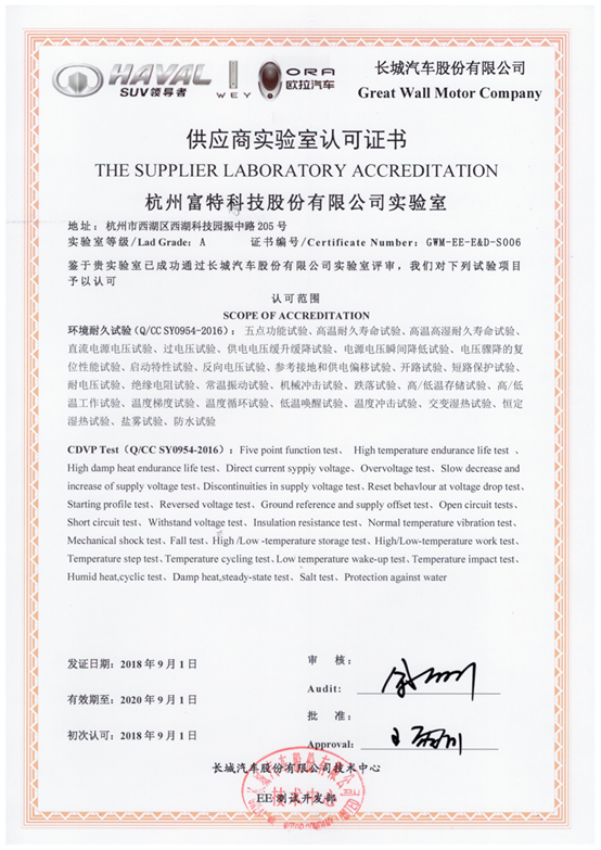 富特科技實驗室獲長城汽車第二方實驗室能力認(rèn)可