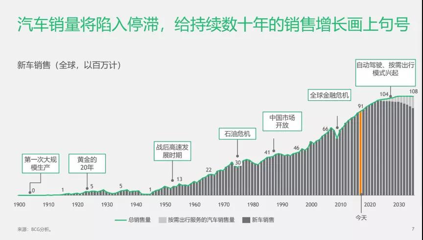 預(yù)測,在2025年之前新車銷售還將繼續(xù)大幅增長,主要是受中國和其他發(fā)展中市場的推動(dòng)。但是在此之后,隨著中國銷量的增速減緩以及共享無人駕駛電動(dòng)汽車的普及加快,汽車銷量將陷入停滯,給持續(xù)數(shù)十年的銷量增長畫上句號(hào)。