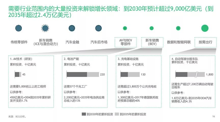 據(jù)BCG預(yù)測,為挖掘出行技術(shù)的潛在價(jià)值,行業(yè)參與者到2030年將需在新增長領(lǐng)域投入超過9000億美元,到2035年則要超過2.4萬億美元,重點(diǎn)投資領(lǐng)域包括自動(dòng)駕駛汽車技術(shù)、電池生產(chǎn)設(shè)施、充電基礎(chǔ)設(shè)施和自動(dòng)駕駛出租車隊(duì)。